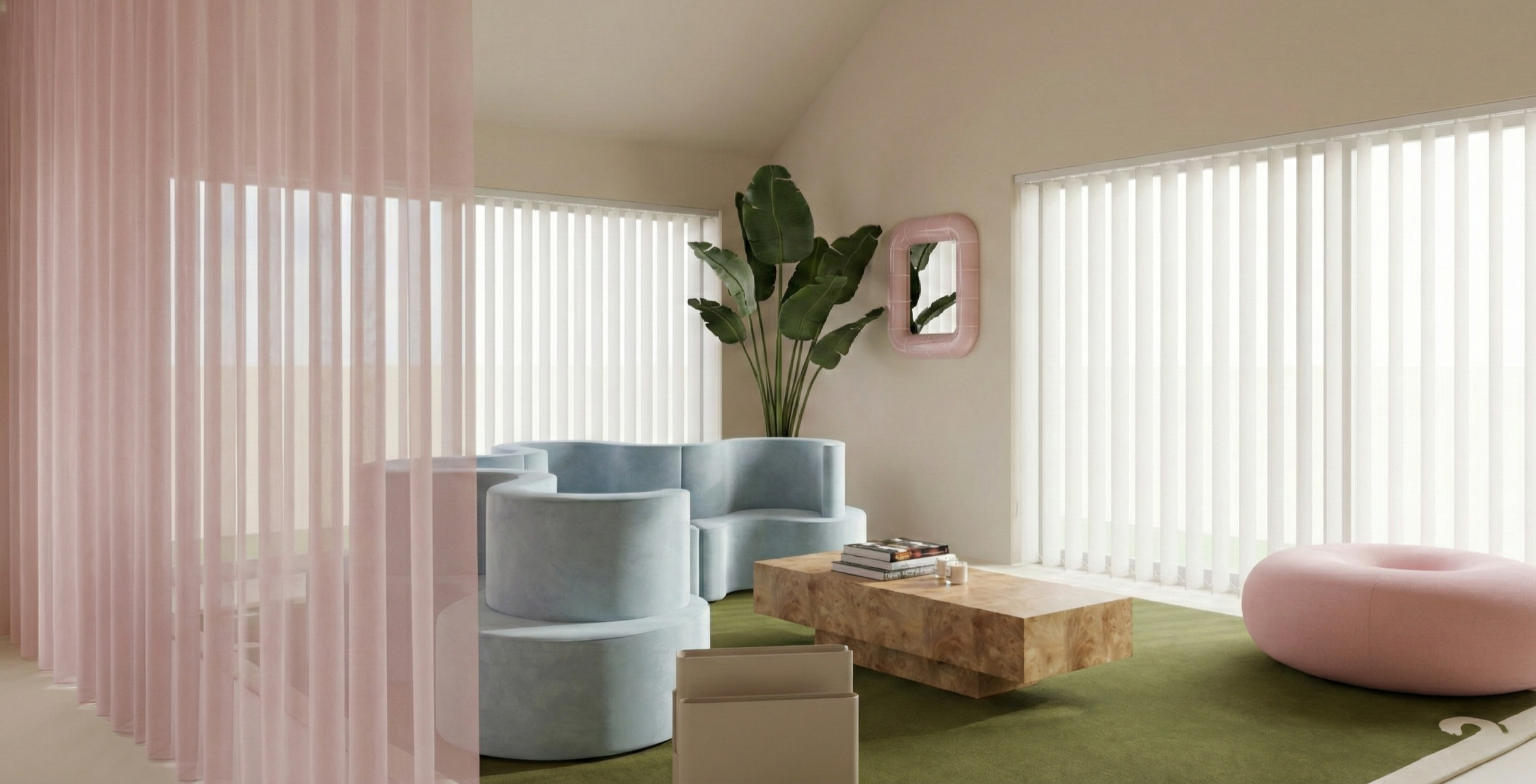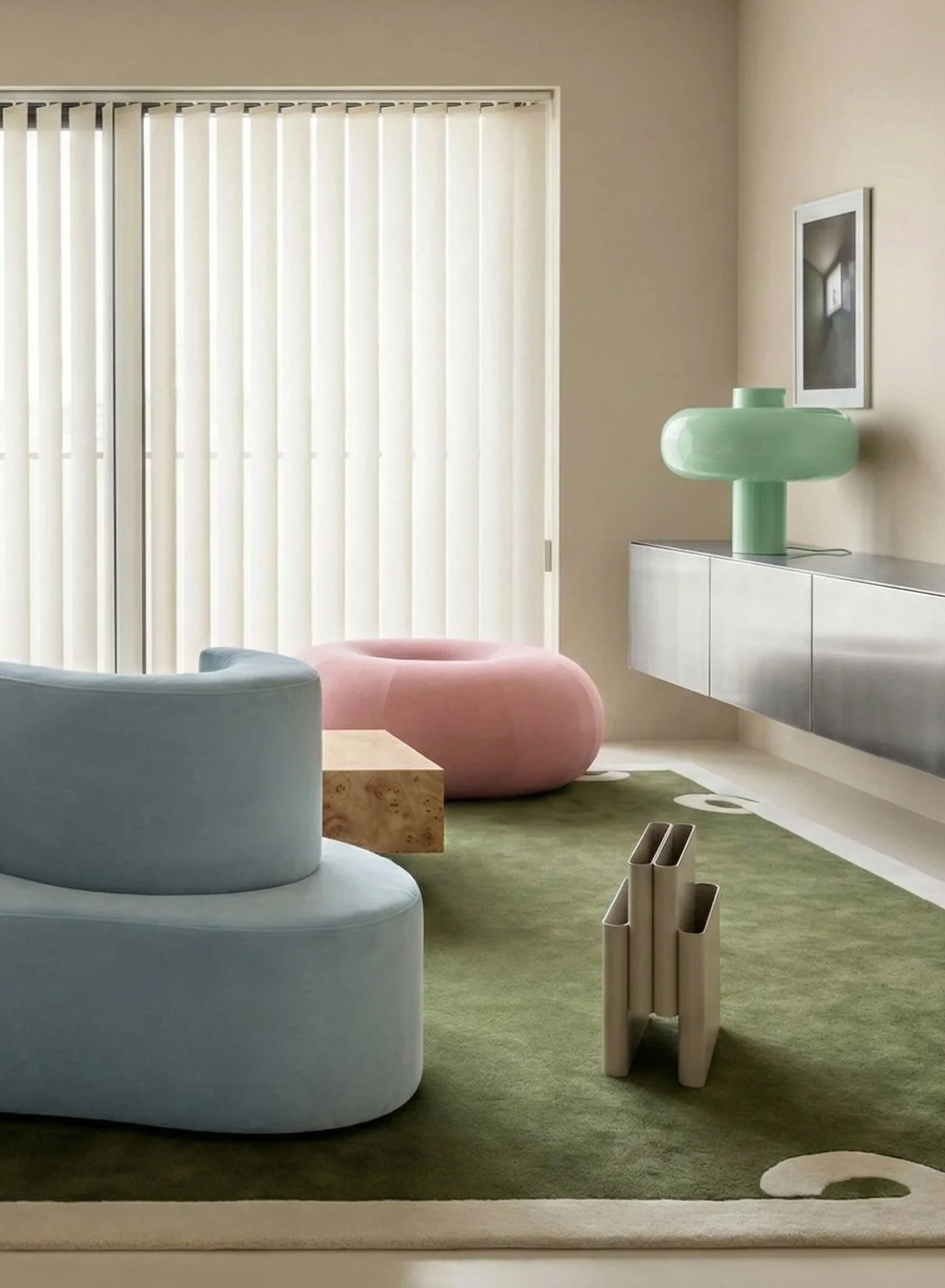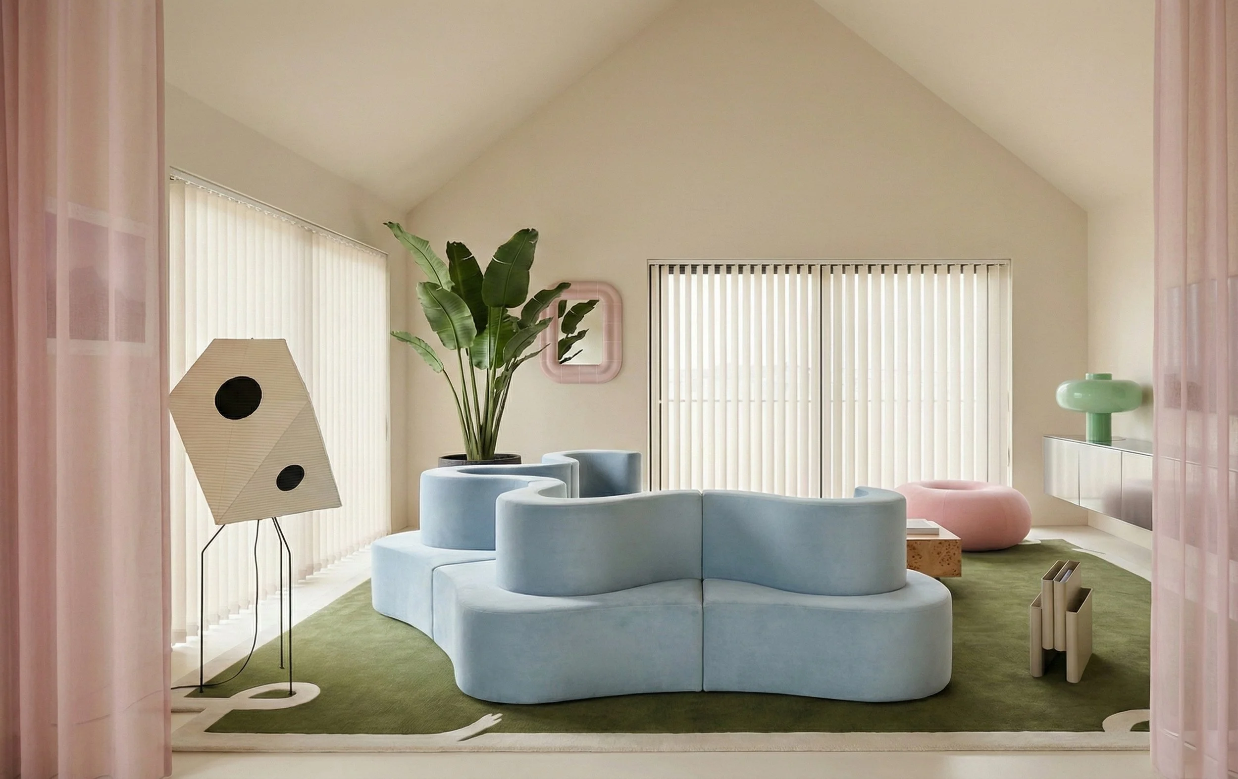 DÉCOUVREZ LES PREMIERS VISUELS DE BUBBLE HOUSE, NOTRE PROJET PENSÉ EN COLLABORATION AVEC LA CABINET D’ARCHITECTURE ROUENNAIS IFJA ! La structure est simple, élégante et épurée, relevée de pastilles de mosaïques, qui viennent, en pied de nez, apporter une touche d’originalité inattendue. L’intérieur est, quant à lui, un véritable terrain de jeu où la curation du mobilier et des accessoires vient apporter une touche décalée et moderne. Le salon répond à cette logique de simplicité; la palette de couleurs est restreinte et l’harmonie globale n’en est que renforcée. La pièce maîtresse est le canapé Cloverleaf de Verner Panton en tissu velours bleu de chez Dedar Milano. À la fois mobilier et sculpture, il donne le ton à un décor ludique, qui ne se prend pas au sérieux! Décor, qui en mixant des pièces iconiques de design et des créations de designers plus contemporains, vient renforcer cet ambiance pop et douce. Le chrome et la loupe de bois apportent une matérialité bien d’actualité et intemporelle à la fois.